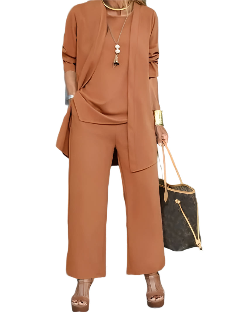 Evelyn sæt inkluderer en hyggelig cardigan, en matchende top og lange bukser, hvilket gør det til en alsidig tilføjelse til din garderobe. Uanset om du slapper af derhjemme eller er på farten, vil dette sæt sikre, at du ser godt ud og føler dig godt tilpas.