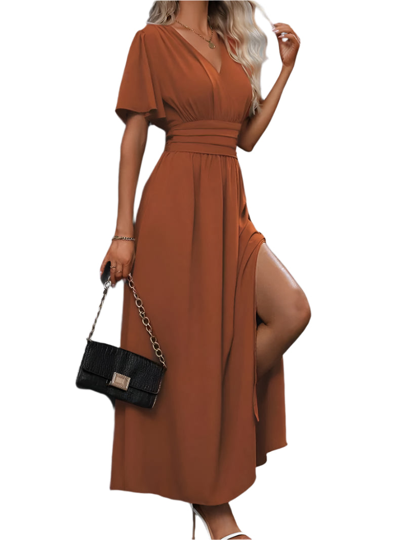 Designet med en romantisk rynket krave og en plisseret talje, tilbyder denne kjole en flatterende pasform, der fremhæver din figur. Den er ideel til bryllupper, galaer eller enhver festlig begivenhed, hvor du ønsker at gøre et varigt indtryk.