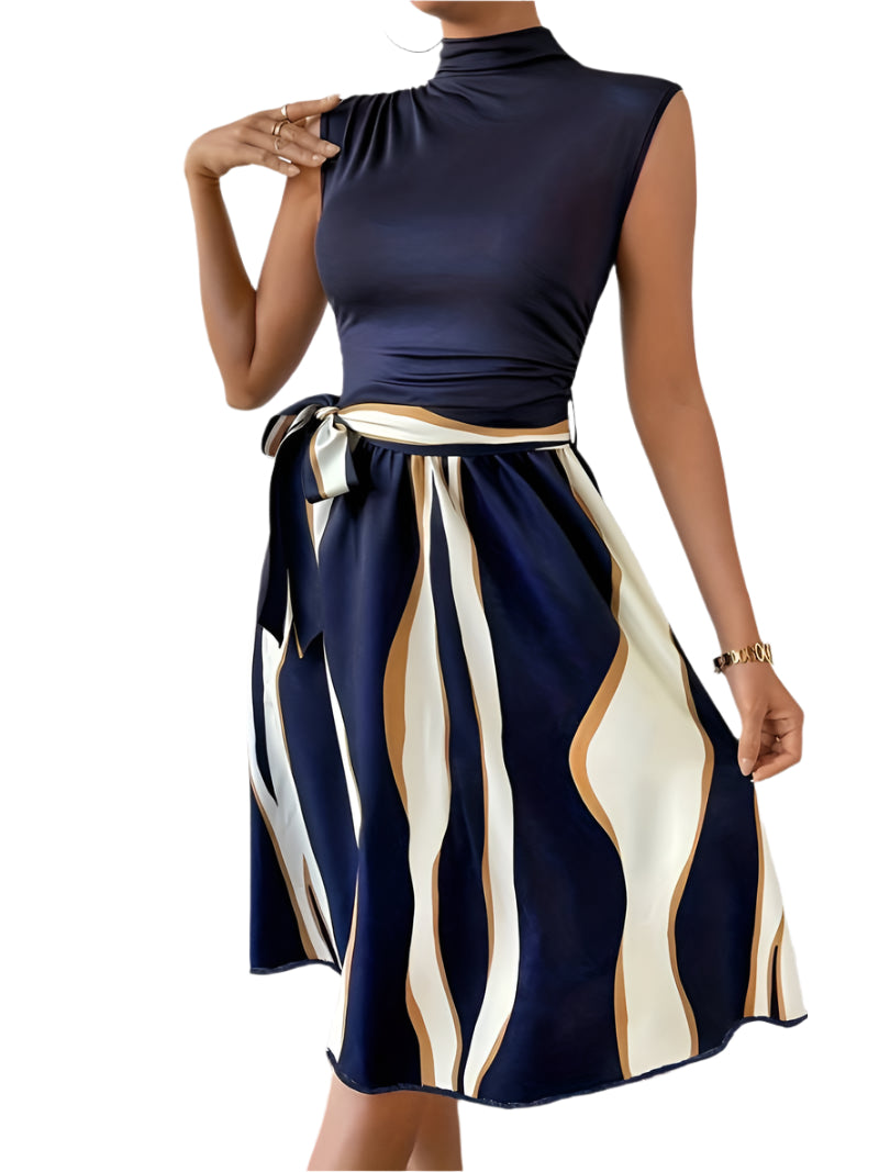 Med sit unikke patchwork-design og flatterende bælte, er denne kjole perfekt til både kontoret og afslappede udflugter med venner. Den trendy mønster giver et friskt pust til din garderobe og gør det nemt at udtrykke din personlige stil.