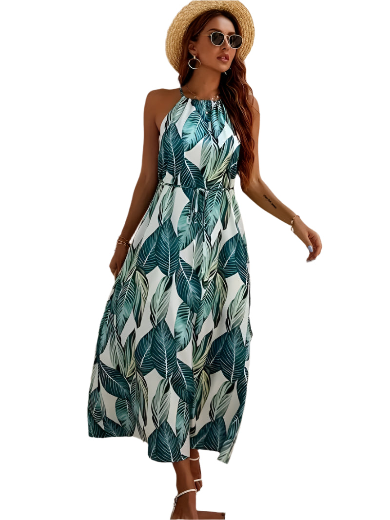 Kvinders Strandkjole Halterneck Let Bomuld med Bladmønster