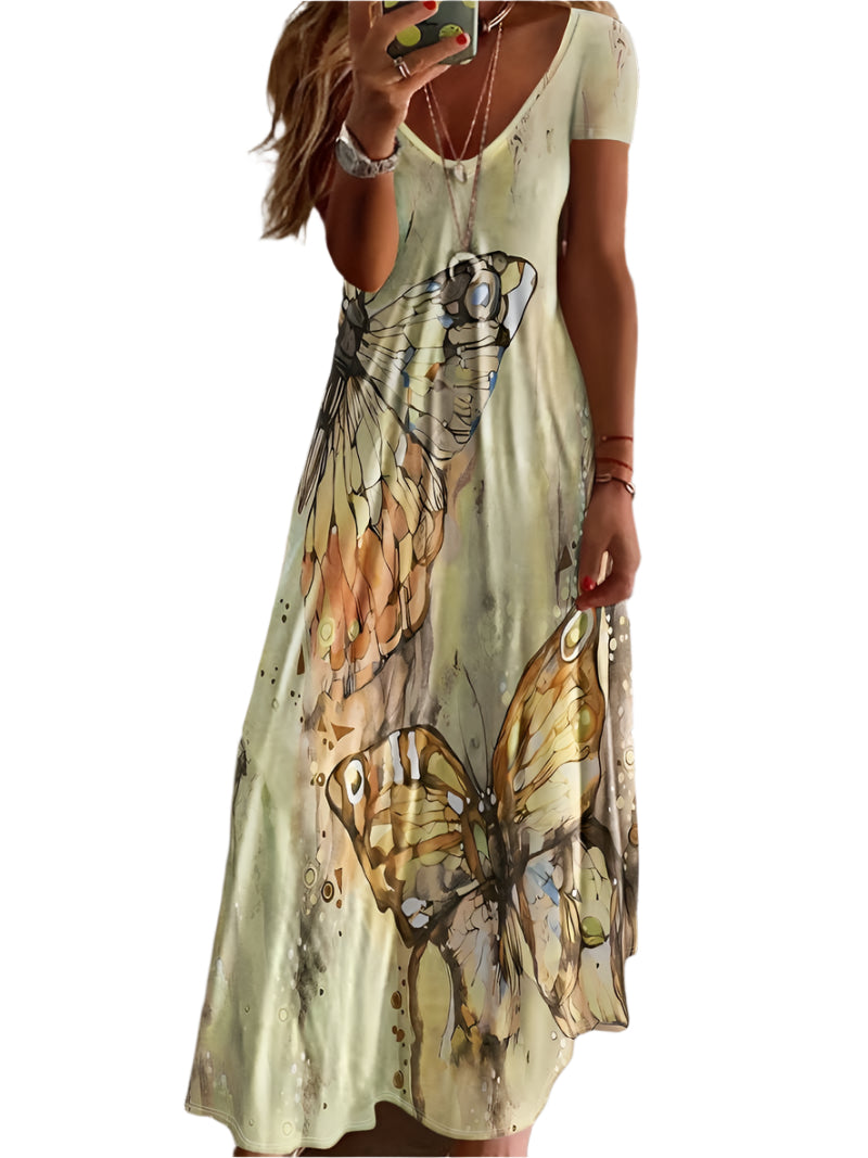 Kvinders V-hals Kjole Sommerfugleprint Let Bomuld