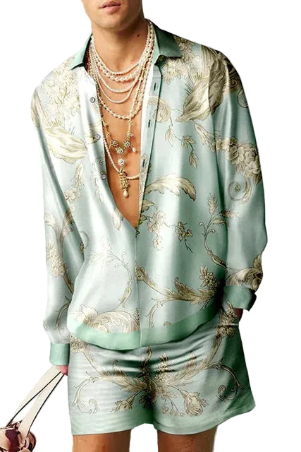 Designet med en kortærmet skjorte og matchende shorts, tilbyder dette sæt en luftig og behagelig fornemmelse. Det tropiske print tilføjer en livlig sommerstemning, perfekt til strandture, ferier eller afslappede middage.