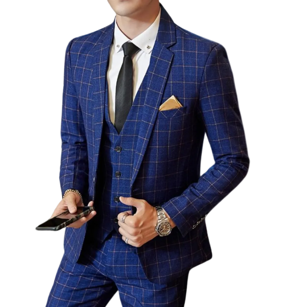 Oplev stil og lethed med denne tredelte plaiddragt, der er perfekt til forårets varme dage. Den skræddersyede struktur og det raffinerede mønster giver et skarpt og selvsikkert look, ideelt til både formelle begivenheder og sociale sammenkomster.