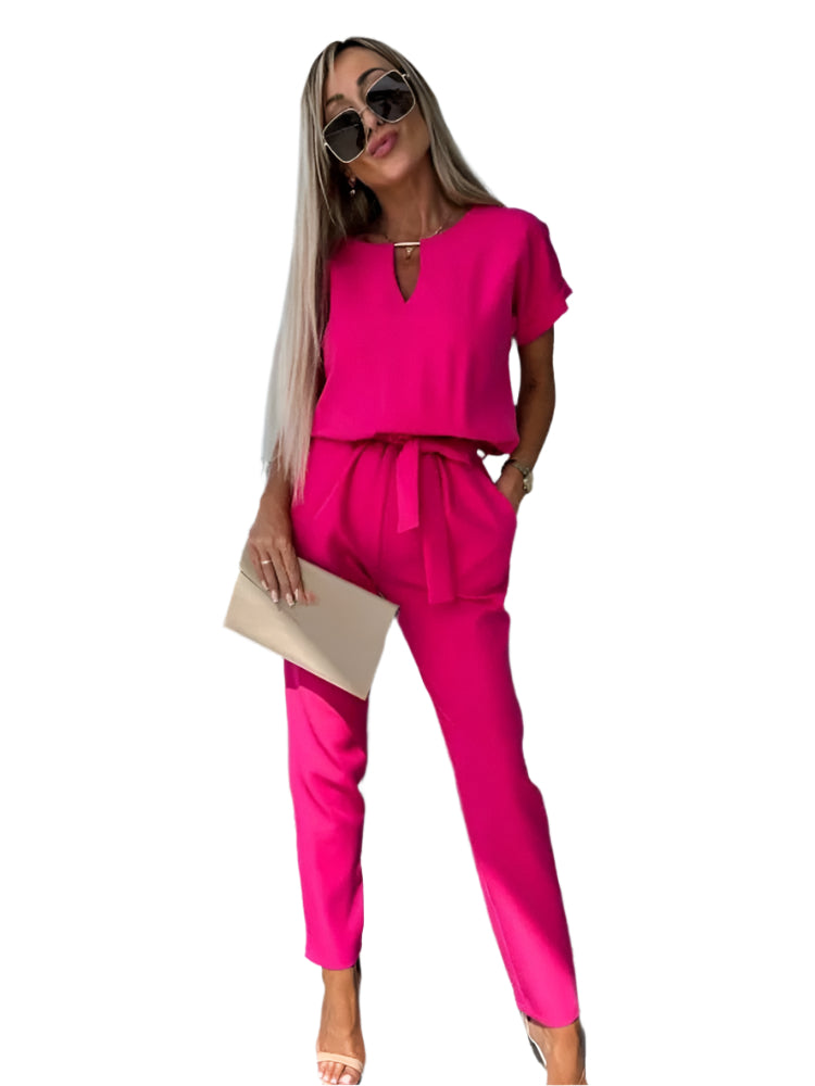 Oplev elegance og stil med denne smukke jumpsuit, der fremhæver dit feminine look. Den flatterende V-hals og de stilfulde korte ærmer gør den til det perfekte valg til enhver lejlighed.
