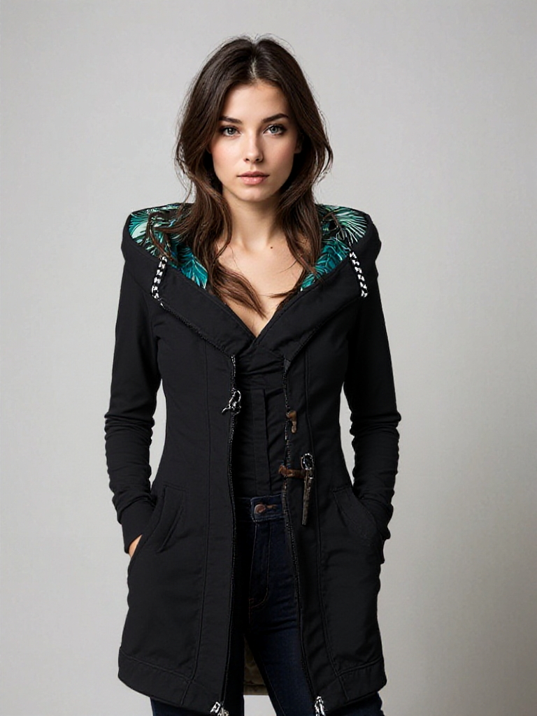 Hoodien har et slankt design, der fremhæver din figur, og det tropiske mønster indvendigt i hætten tilføjer et legende touch. Den er ideel til både hverdag og udendørs aktiviteter.