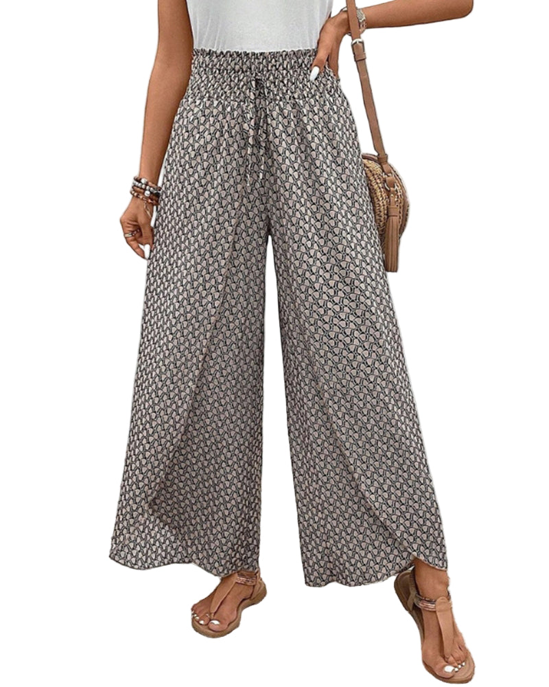 Designet med et iøjnefaldende geometrisk tryk, tilbyder disse bukser et friskt og stilfuldt udtryk. Den høje talje og det lange, vide ben skaber en flatterende silhuet, der strækker benene og giver et elegant look.