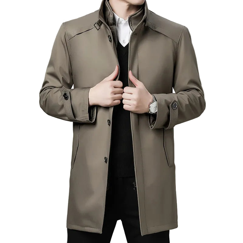 Frakken er designet med en slank standkrave og lynlåslomme, hvilket giver et strømlinet udseende. Den er perfekt til at holde dig varm, samtidig med at den opretholder et professionelt look.