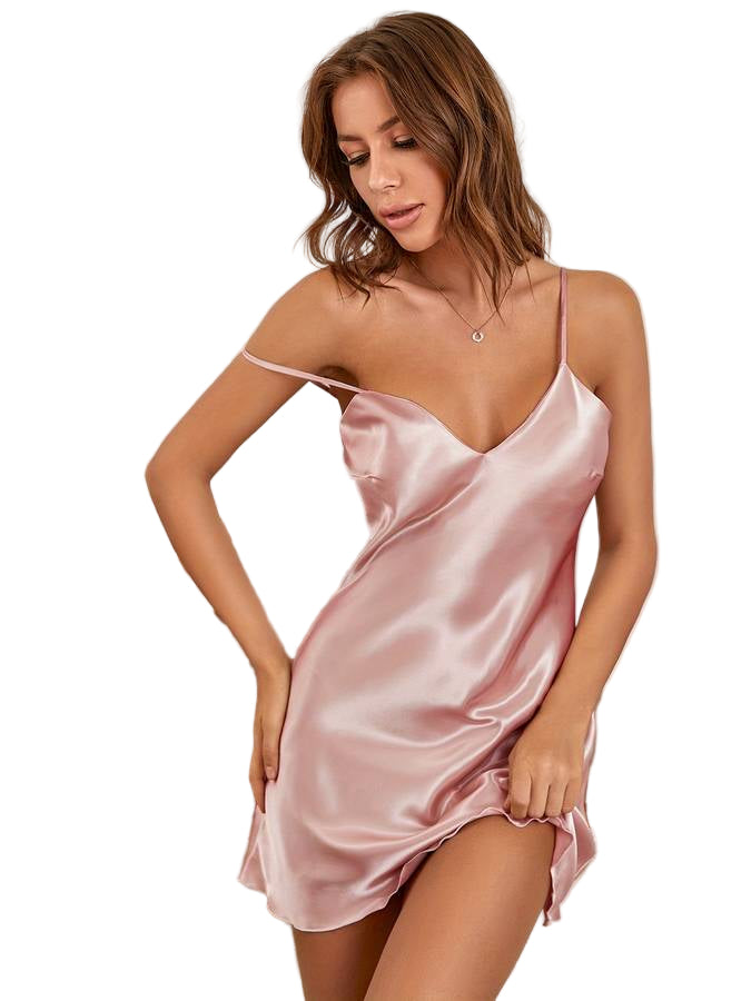 Designet med en forførende V-hals og delikate spaghetti-bånd, skaber denne kjole en raffineret silhuet. Det luksuriøse satinmateriale giver et blødt og skinnende udseende, der gør dig til centrum for opmærksomheden.