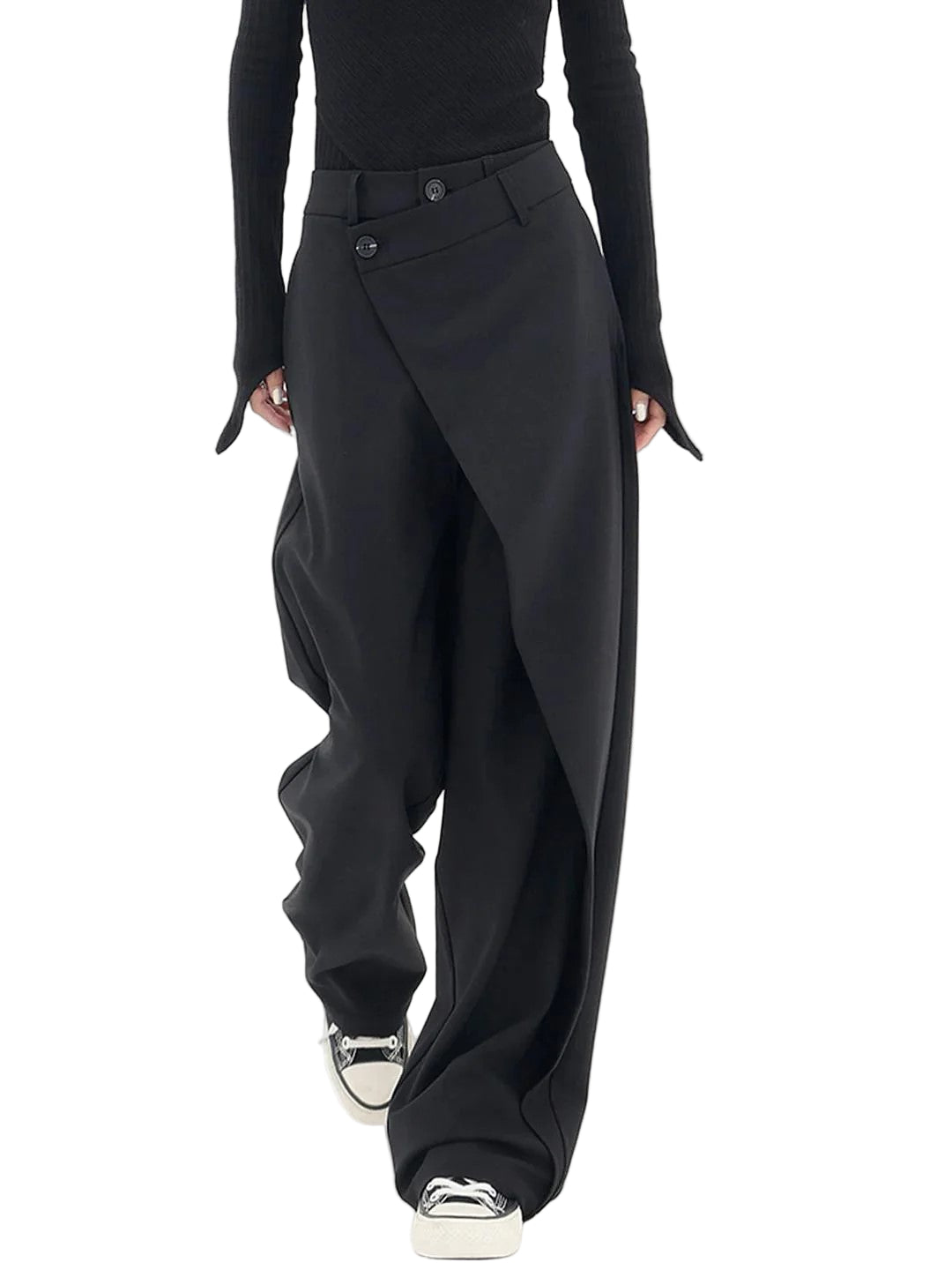 Disse bukser har en løs og baggy silhuet, der sikrer bevægelsesfrihed, mens den asymmetrisk talje tilføjer et dristigt og moderne præg. Uanset om du skal til en fest eller bare vil have et afslappet outfit, vil disse bukser være et ideelt valg.